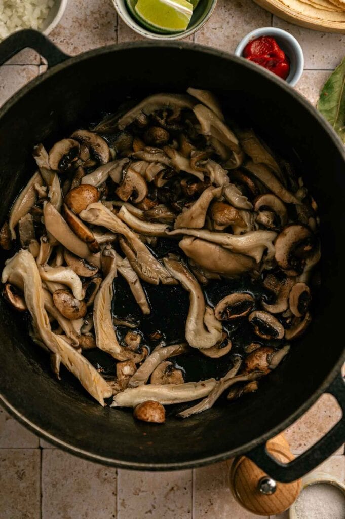 Heat 1 tablespoon of vegetable oil in a large pot over medium-high heat. A Dutch oven works beautifully here because it holds heat evenly and gives the mushrooms room to brown rather than steam. A wide sauté pan also works well if you don’t have a Dutch oven.