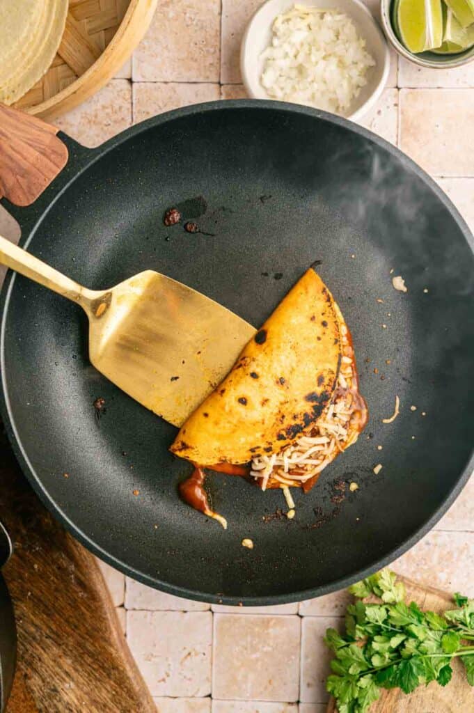 • Brush with chile oil: Don’t skip skimming that oil from the top of the consommé. Brushing it onto the folded taco before flipping gives you extra crispiness and a deeper chile flavor on the outside.