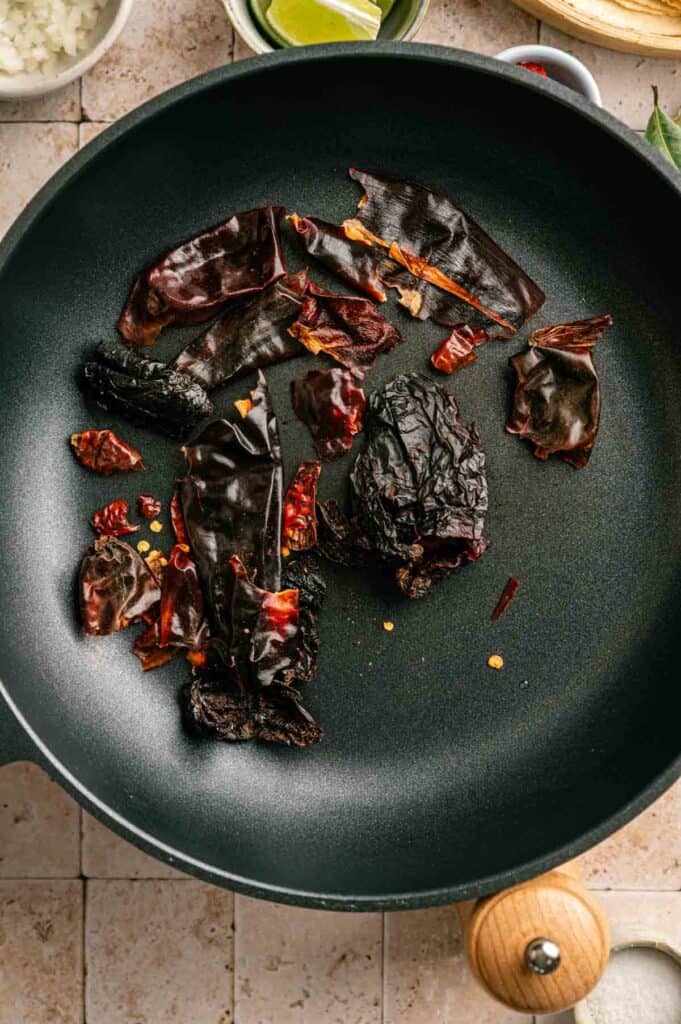 Get a dry skillet over medium heat and add your ancho chiles and guajillo chiles. I always use a nonstick large skillet, which gives me even heat distribution here, so nothing scorches before it has a chance to toast properly.