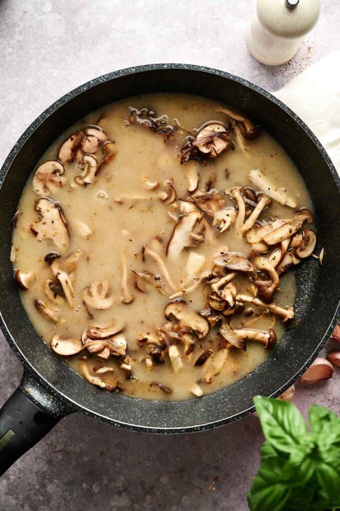 Let everything cook down for about 8 to 10 minutes until the mushrooms are golden and most of the liquid is gone. If you stop too early, the mushrooms may turn out rubbery and the gravy won’t develop the same depth of flavor, so it’s worth letting them caramelize a bit.